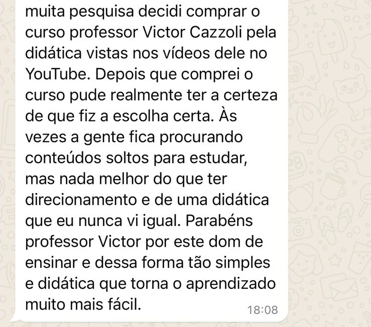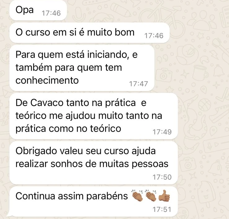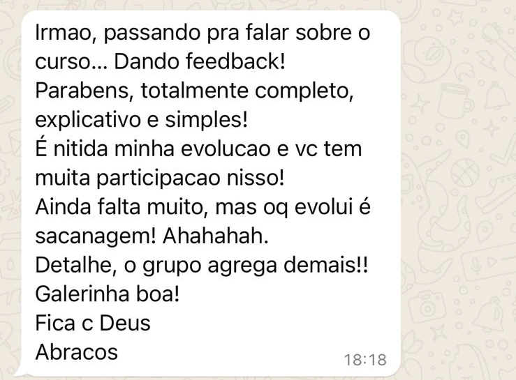 Você terá acesso a um número de whatsapp para tirar suas dúvidas de forma personalizada, diretamente com o professor. Você poderá enviar vídeos para que o professor analise e lhe dê a devida orientação.